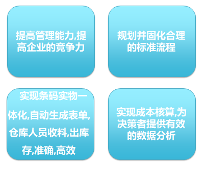 在业务操作中应用条码技术,数据的自动化采集,即时性录单,省掉了手工书写单据和录入的步骤,大大提高工作效率,减少无效劳动、消除因信息不准引起的附加库房存量、提高资金利用率等目的;