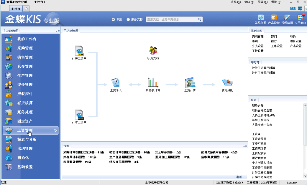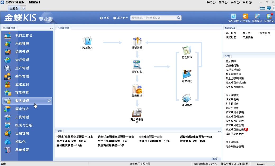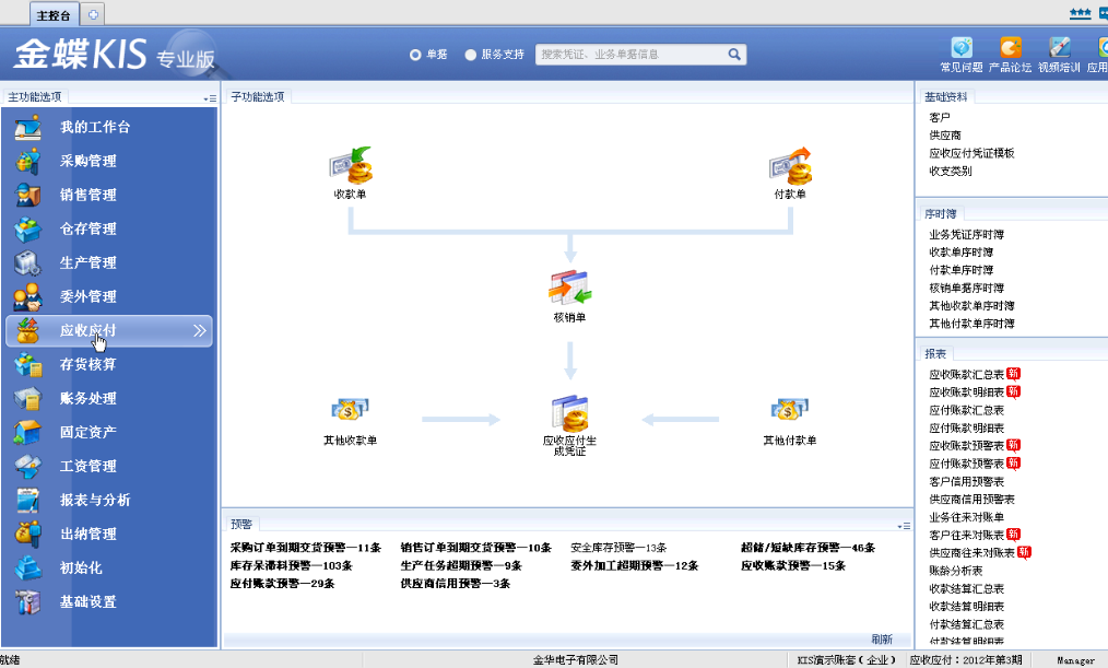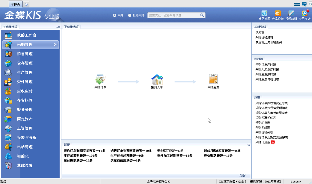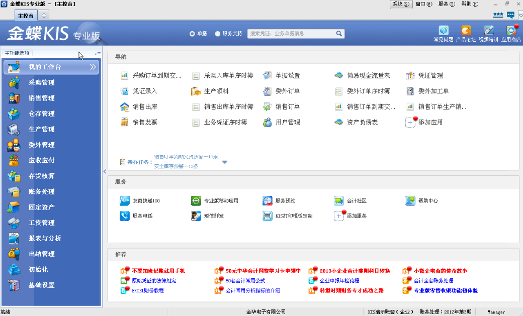 金蝶KIS专业版以“让生产企业管理更简单”为核心理念,软件功能全面覆盖中小型企业管理的五大关键环节:采购管理、销售管理、生产管理、仓存管理、财务管理,以丰富的报表为企业管理者提供实时查询和决策依据;在将财务、业务进行一体化管理的同时,突破局域网应用模式,整合基于云+端新型服务模式的云管理平台,丰富的应用将最大化地满足企业的个性化需求。