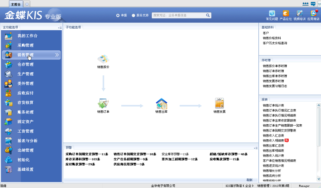 支持现销、赊销、委托代销等多种销售方式;客户信用管理;多价格管理体系,按客户、数量、时间设置价格;报价管理、订单执行进度跟踪;销售和盈利情况分析、销售业绩分析。