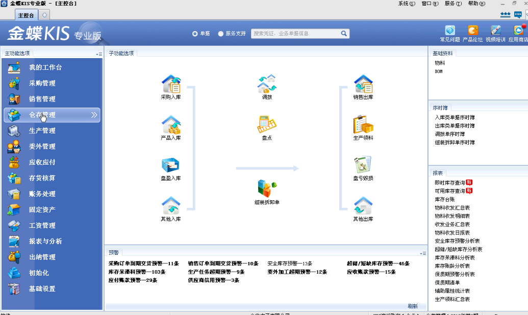 支持多种常规出入库业务及产品组装、拆卸、盘点业务;支持动态盘点;支持存货批次管理、保质期管理;全面的安全库存预警机制;准确的即时库存、考虑在订量的可用库存查询;丰富的仓存统计分析报表。