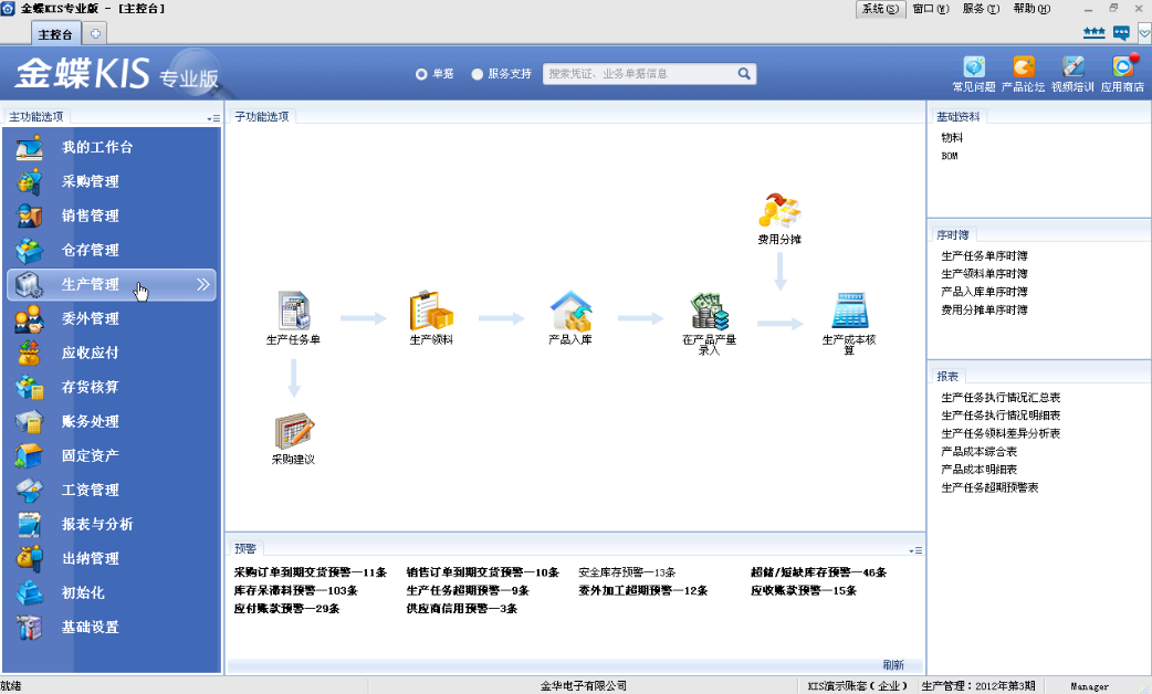 以生产任务单为核心,进行生产领料和产品入库;按需领料、分批领料,有效记录领料情况;生产进度全程跟踪,提供多维度生产统计分析报表;费用分摊,生产成本自动核算;支持多级BOM管理。