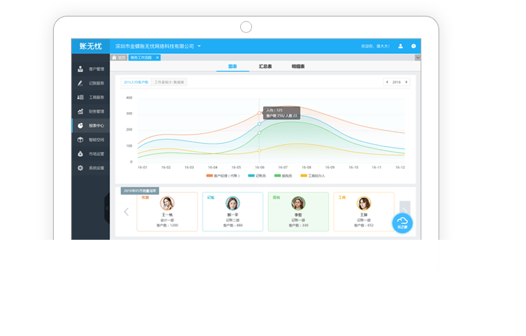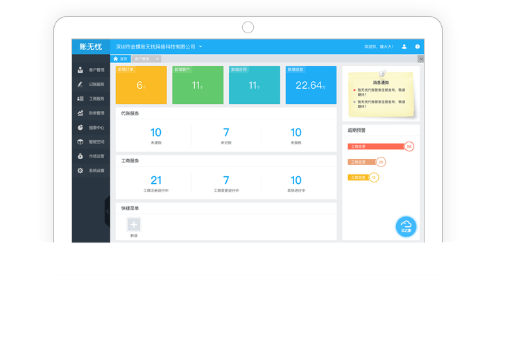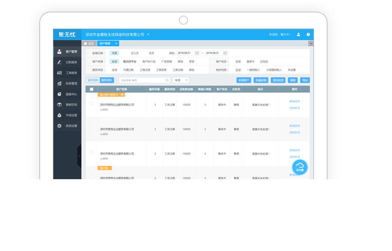 提供客户管理、合同管理、收款管理、记账报税、工商注册等服务的全流程管理,提升代账公司的服务质量和效率,大幅降低运营成本。
