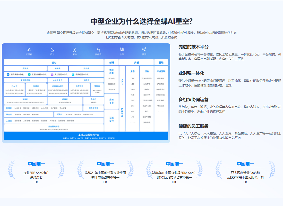 金蝶AI星空是基于国内首款自主可控的云原生架构平台——金蝶AI苍穹PaaS平台,全新构建的、面向高成长型企业的EBC(企业业务能力)系统[1]。它深度融合云计算、大数据、移动互联网与人工智能技术,为企业提供“平台+业务+财务+税务”一体化的SaaS服务,旨在通过数据和智能助力企业实现韧性成长与数智化转型[1]。