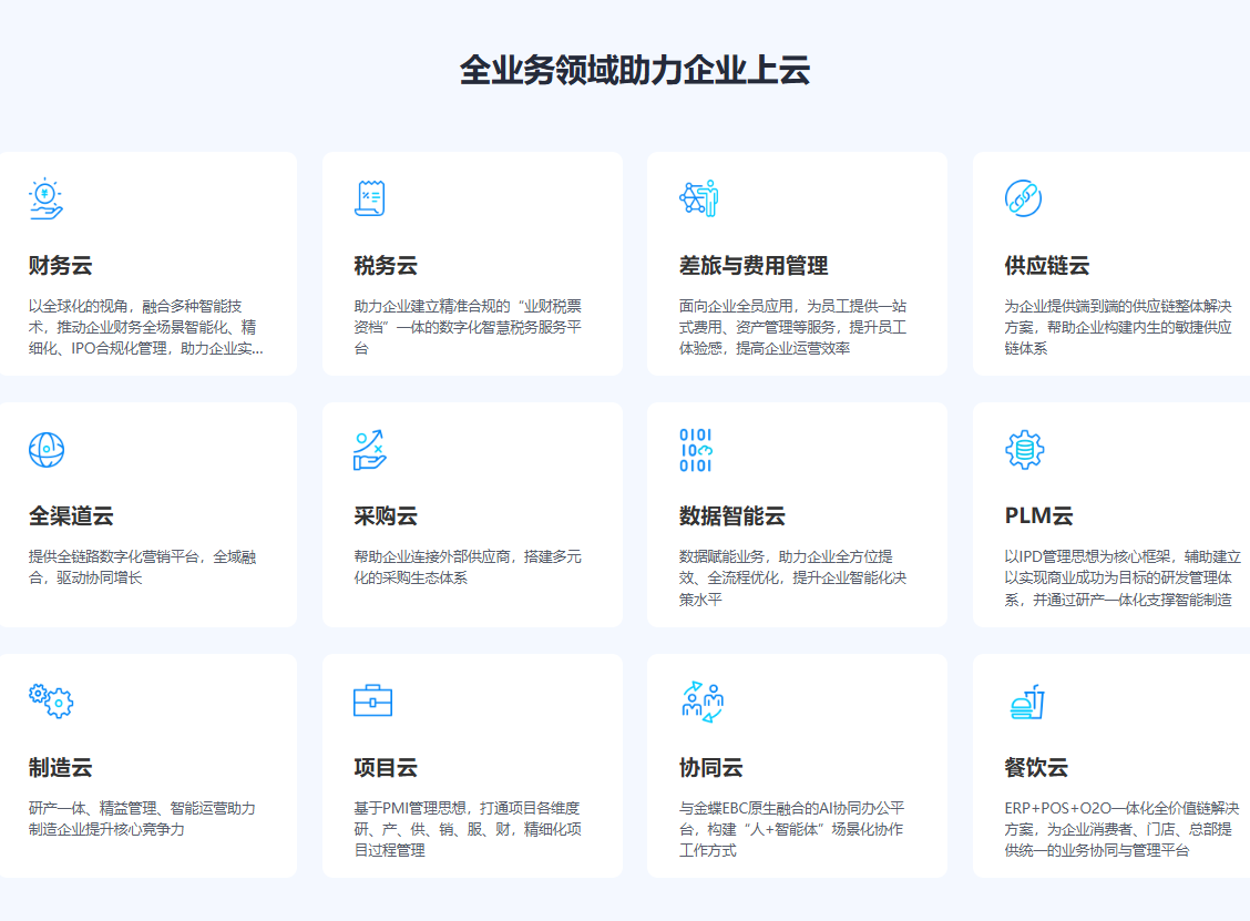 员工服务与协同:提供差旅及费用管理、人人业务、协同办公、知识管理等功能,提升员工体验与协作效率[2]。